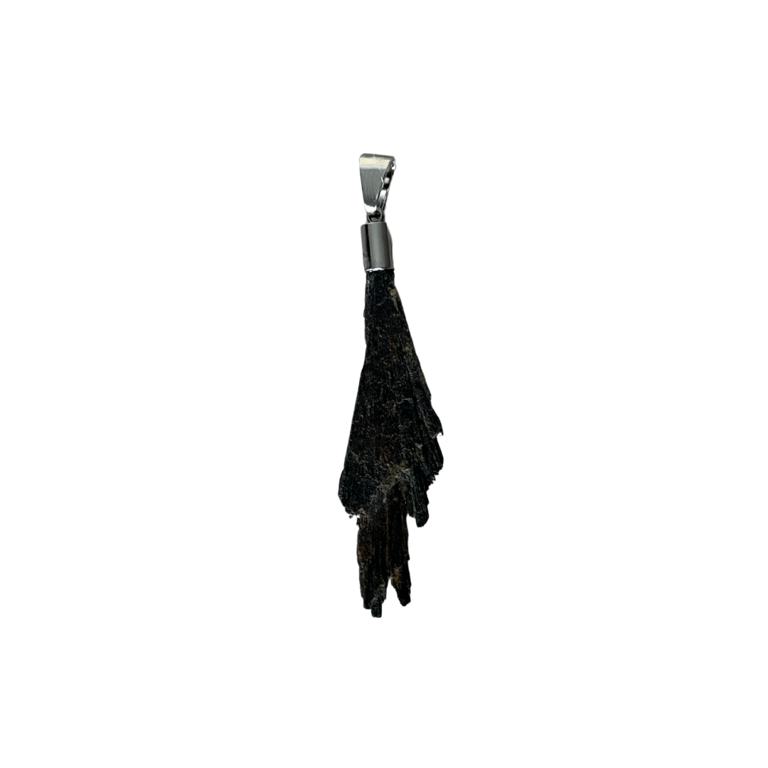 O Pingente Vassoura de Bruxa feita com cristal Cianita Preta natural e acabamento em tulipa de semijoia prateada. Mais do que um acessório, é um amuleto de proteção energética para o seu dia a dia.